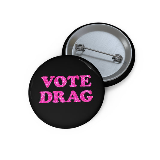 VOTE DRAG Activism Pin Button, Pink Glitter on Black