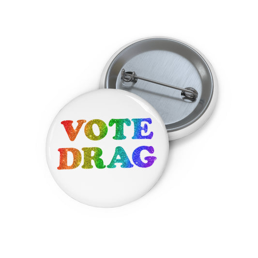VOTE DRAG Activism Pin Button in Rainbow Glitter on White
