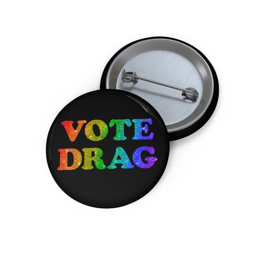 VOTE DRAG Activism Pin Button in Rainbow Glitter on Black