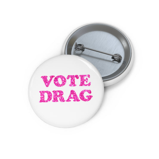 VOTE DRAG Activism Pin Button, Pink Glitter on White