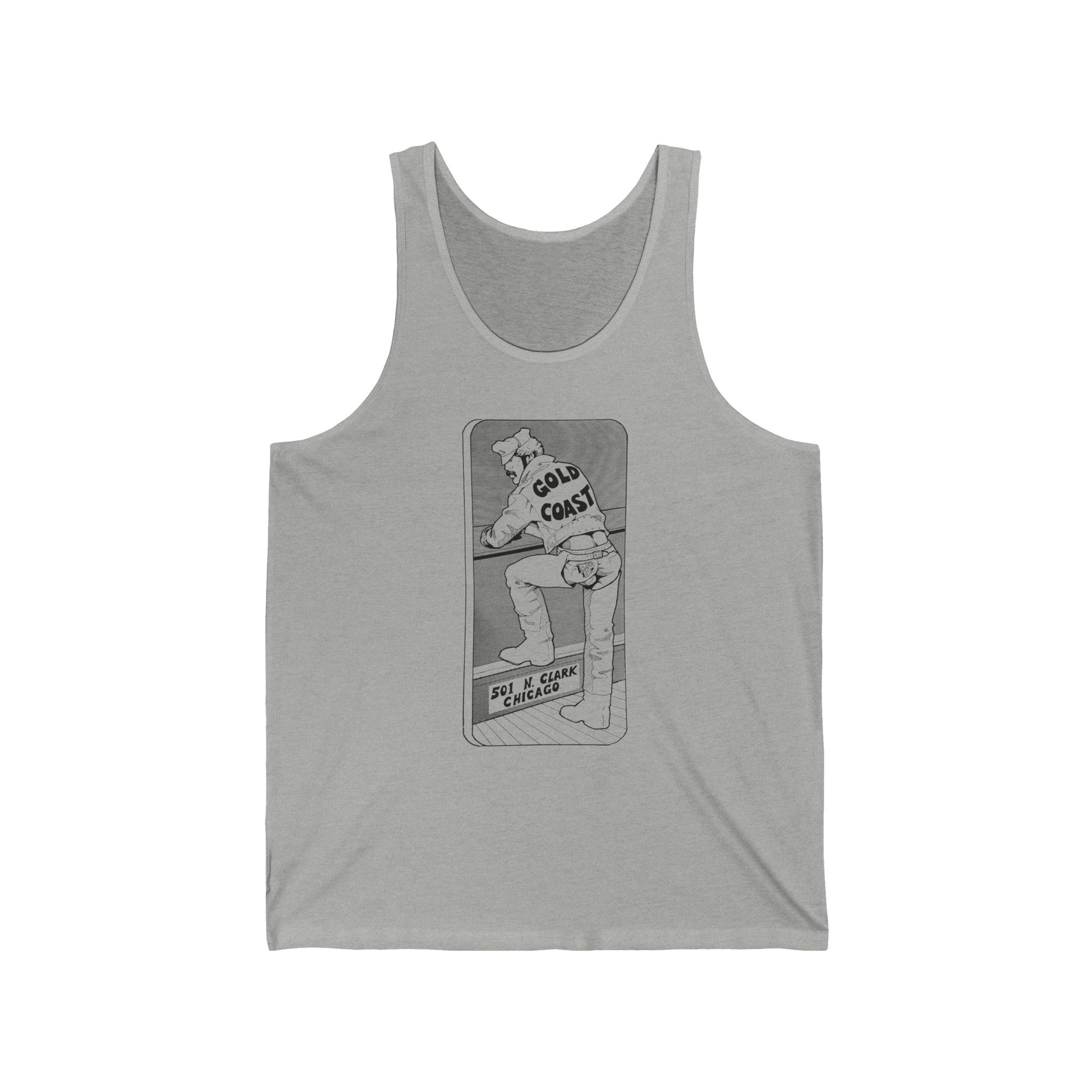 This GOLD COAST tank top pays tribute to the legendary Gold Coast bar of Chicago, a cornerstone of Midwestern leather culture and queer nightlife. Featuring an archival-style illustration of a leather man in chaps, the design nods to an era when bars like the Gold Coast were more than nightlife. They were sanctuaries, meeting points, and sites of hard-won visibility. This piece honors the erotic confidence, toughness, and community that defined Chicago’s leather scene and helped shape queer history from the inside out.