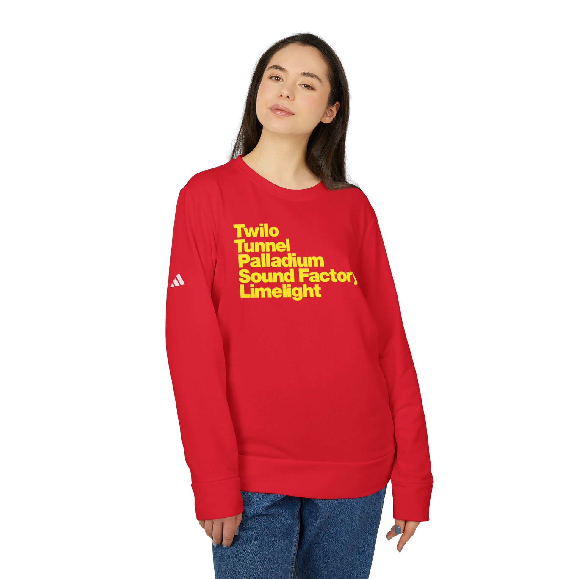 Twilo Tunnel Limelight Palladium Sound Factory Adidas® Fleece Crewneck Sweatshirt - NYC 90s Nightlife Collection - Yellow Deco on Red